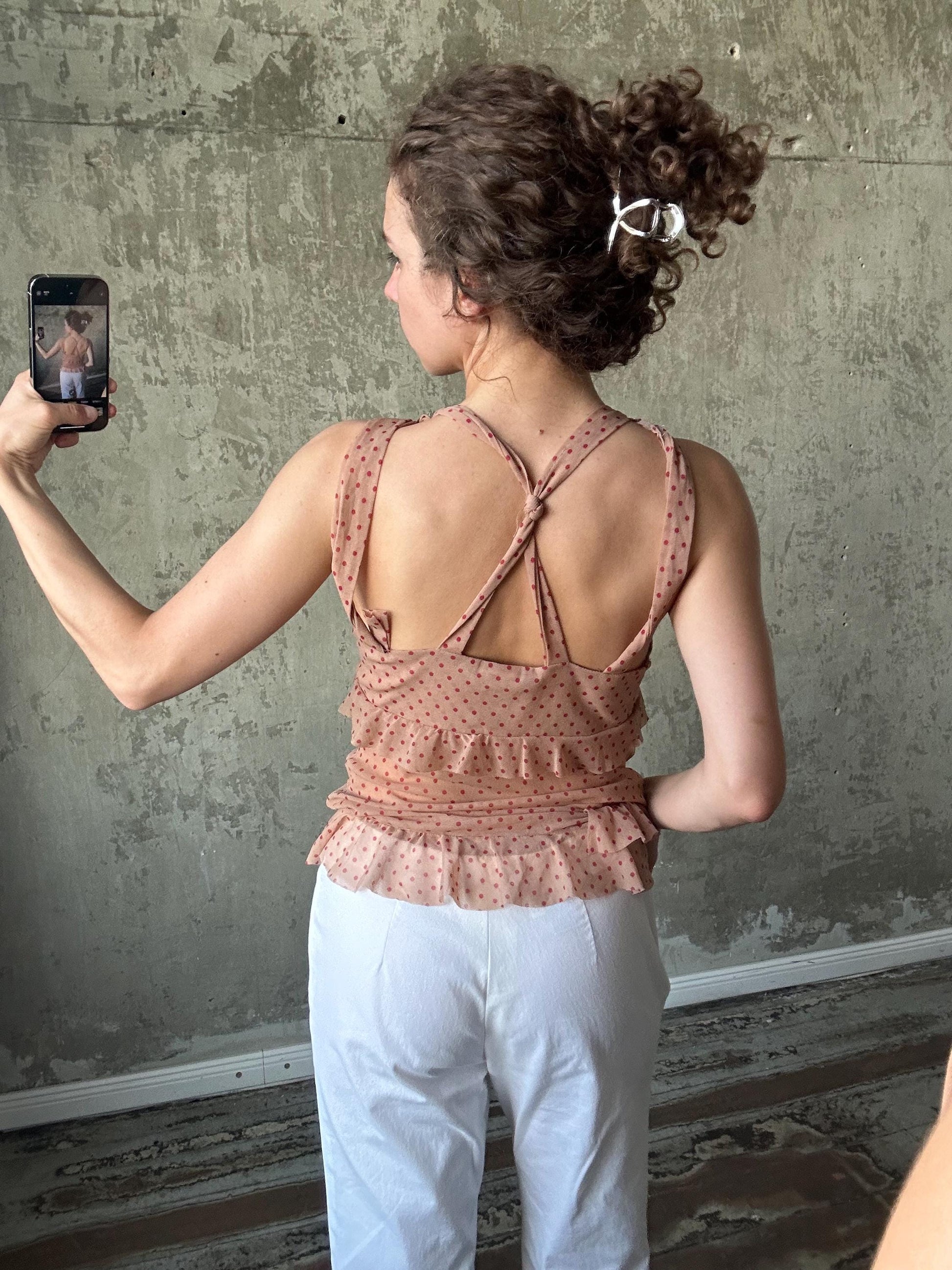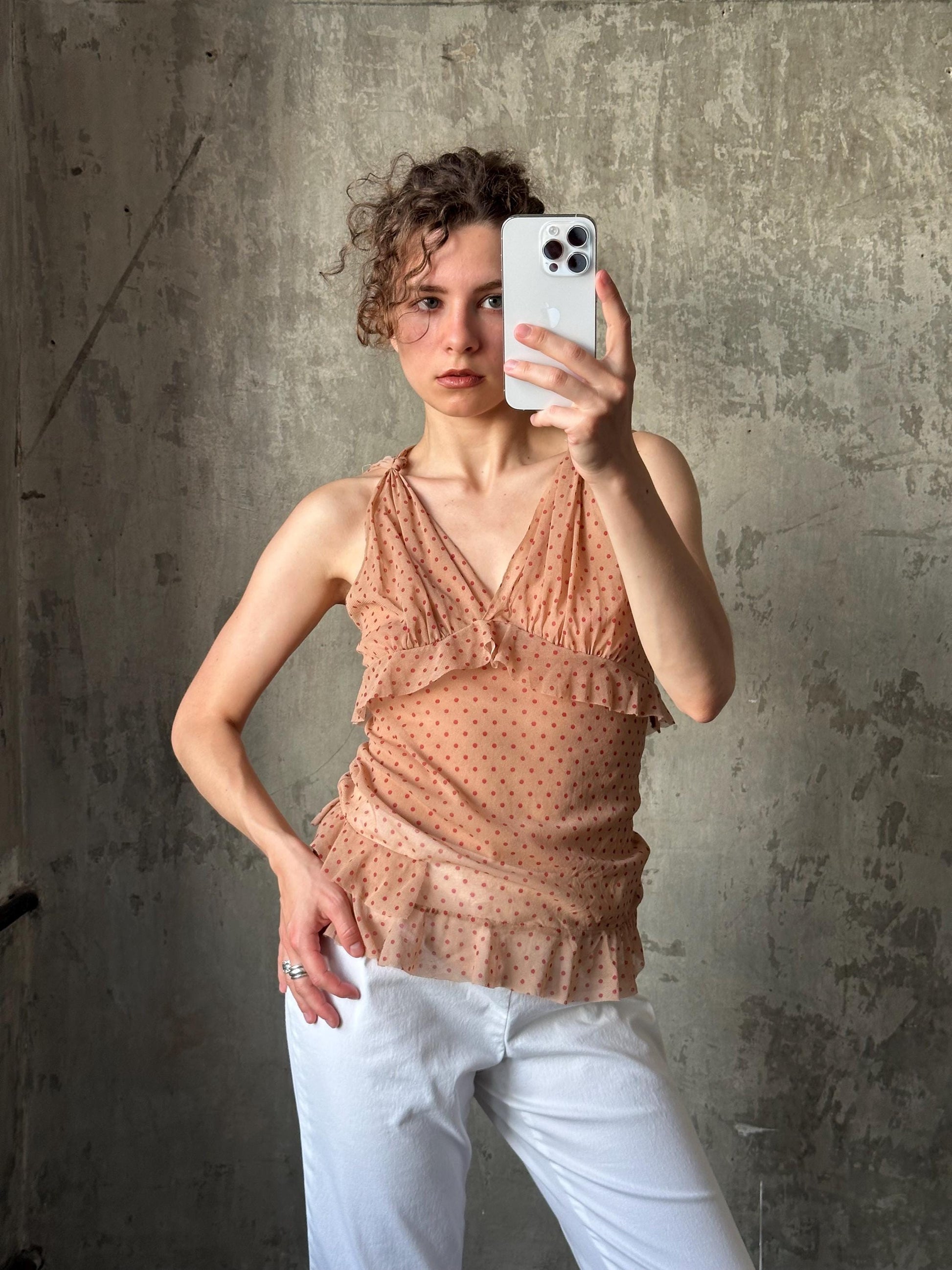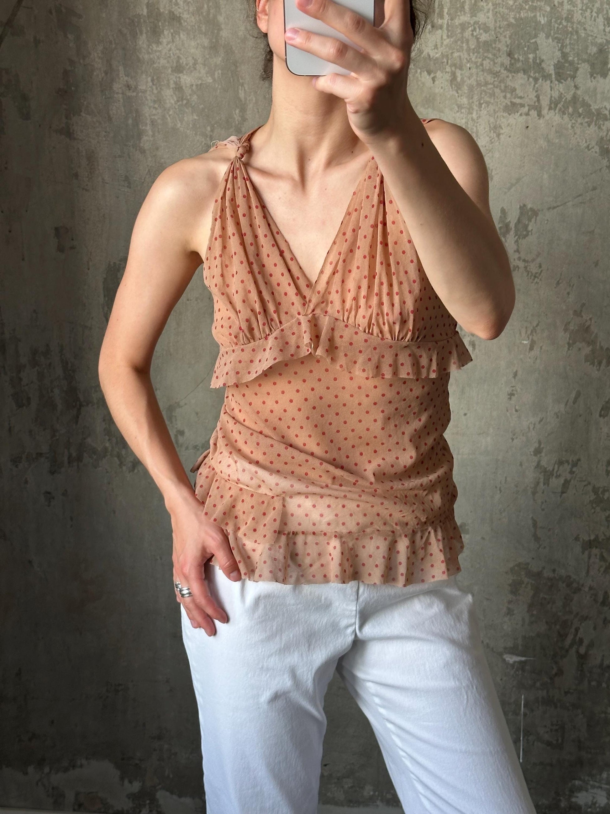 Vintage 00s Liu Jo polka dot sleeveless top in beige, fits XS-S, sleeveless, on straps (not adjustable), decorated with flounces, loose-fit, transparent, very light, perfect vintage condition