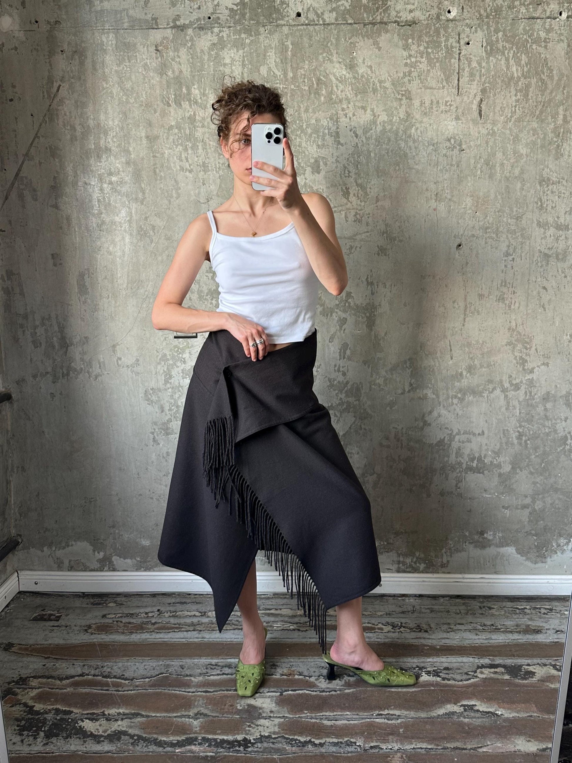 Vintage 00's Cop Copine asymmetric maxi skirt in dark brown, wrapped, fringed, scarf-like, maxi length, made of wool, dense, fits XS-M, loose fit, button-down closure, high-quality fabrics, and perfect vintage condition