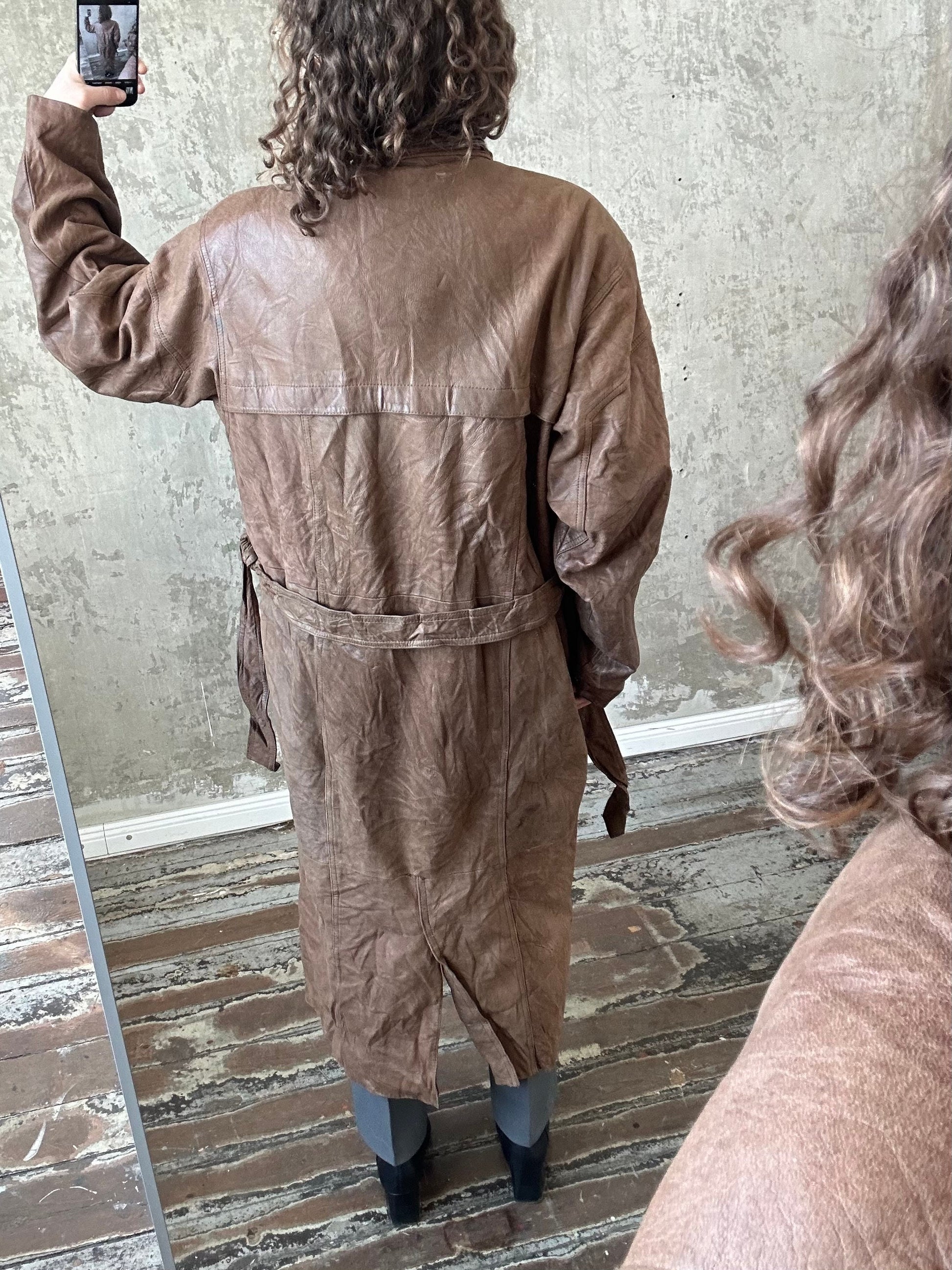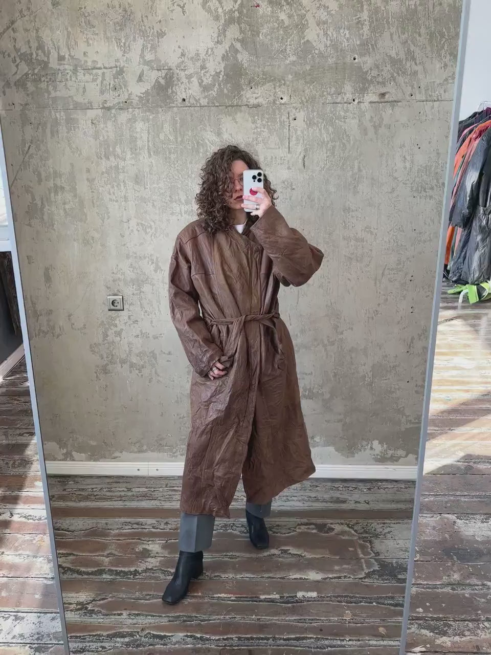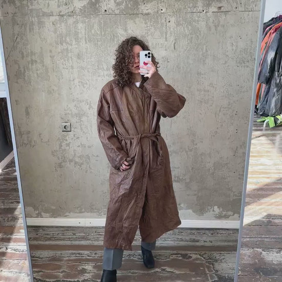 Vintage 90s IOU leather coat in brown, maxi length, gender neutral, belted, zipper closure, padded, fits S-M, genuine leather, oversized/loose fit, massive, good vintage condition