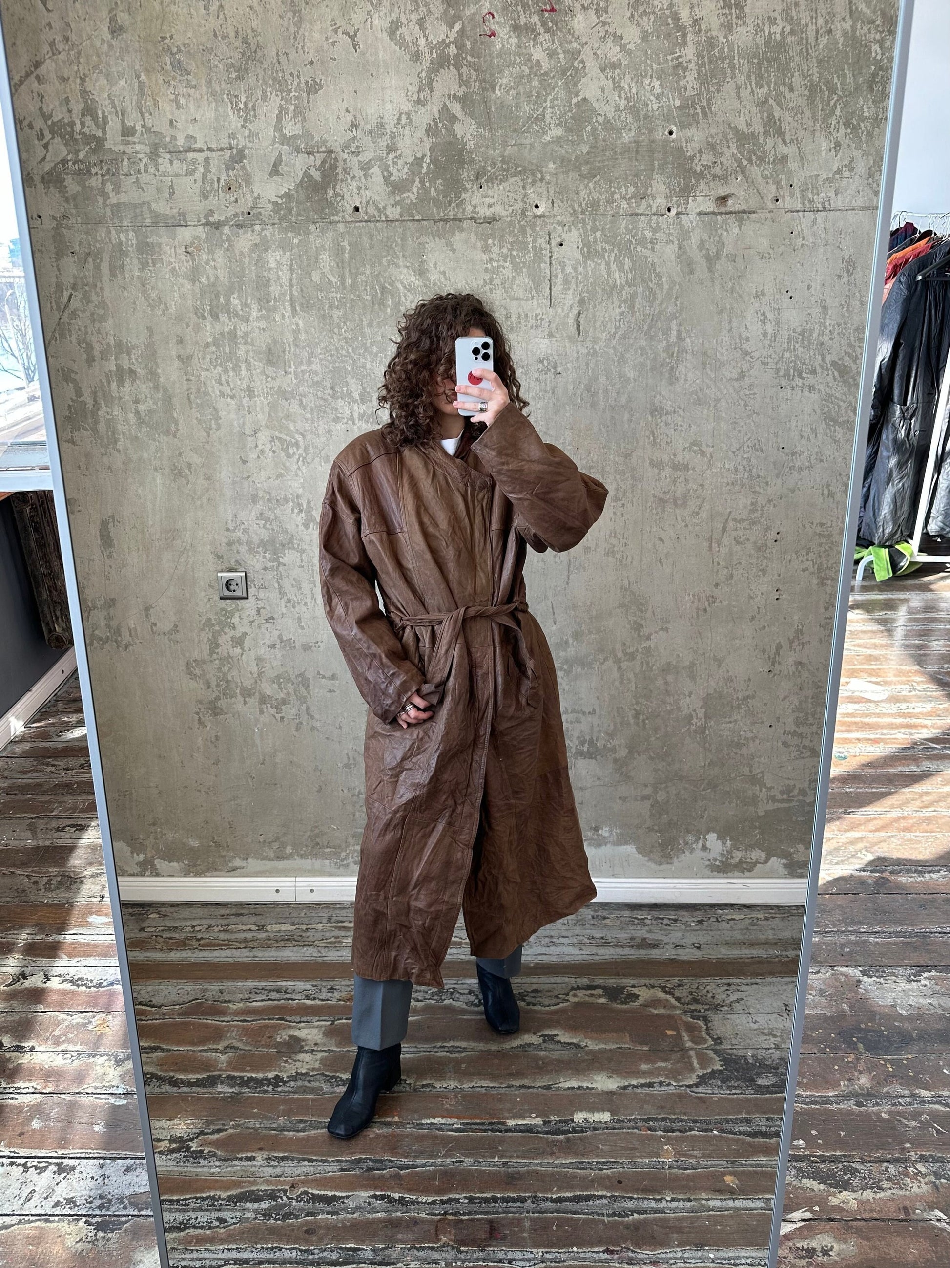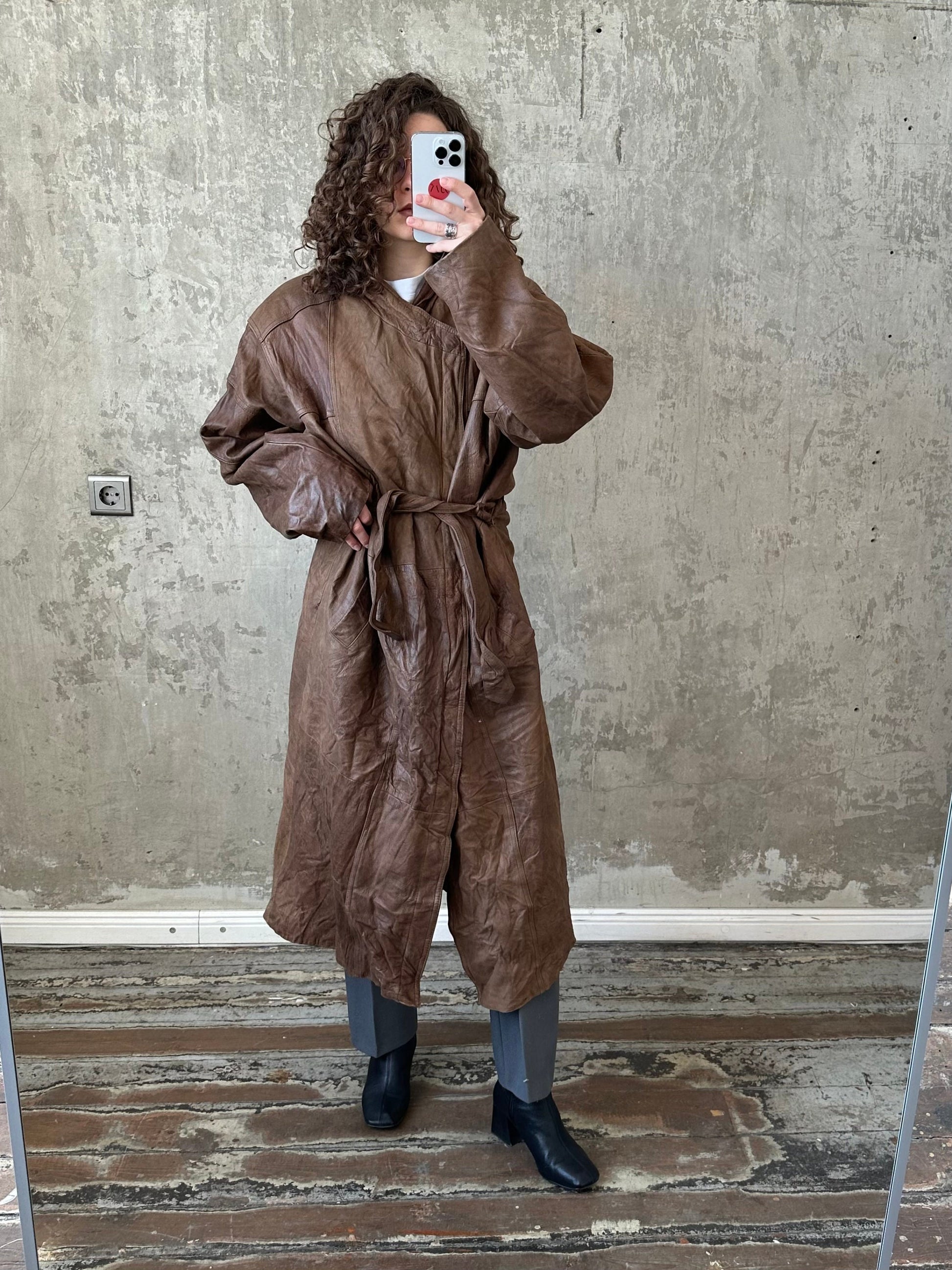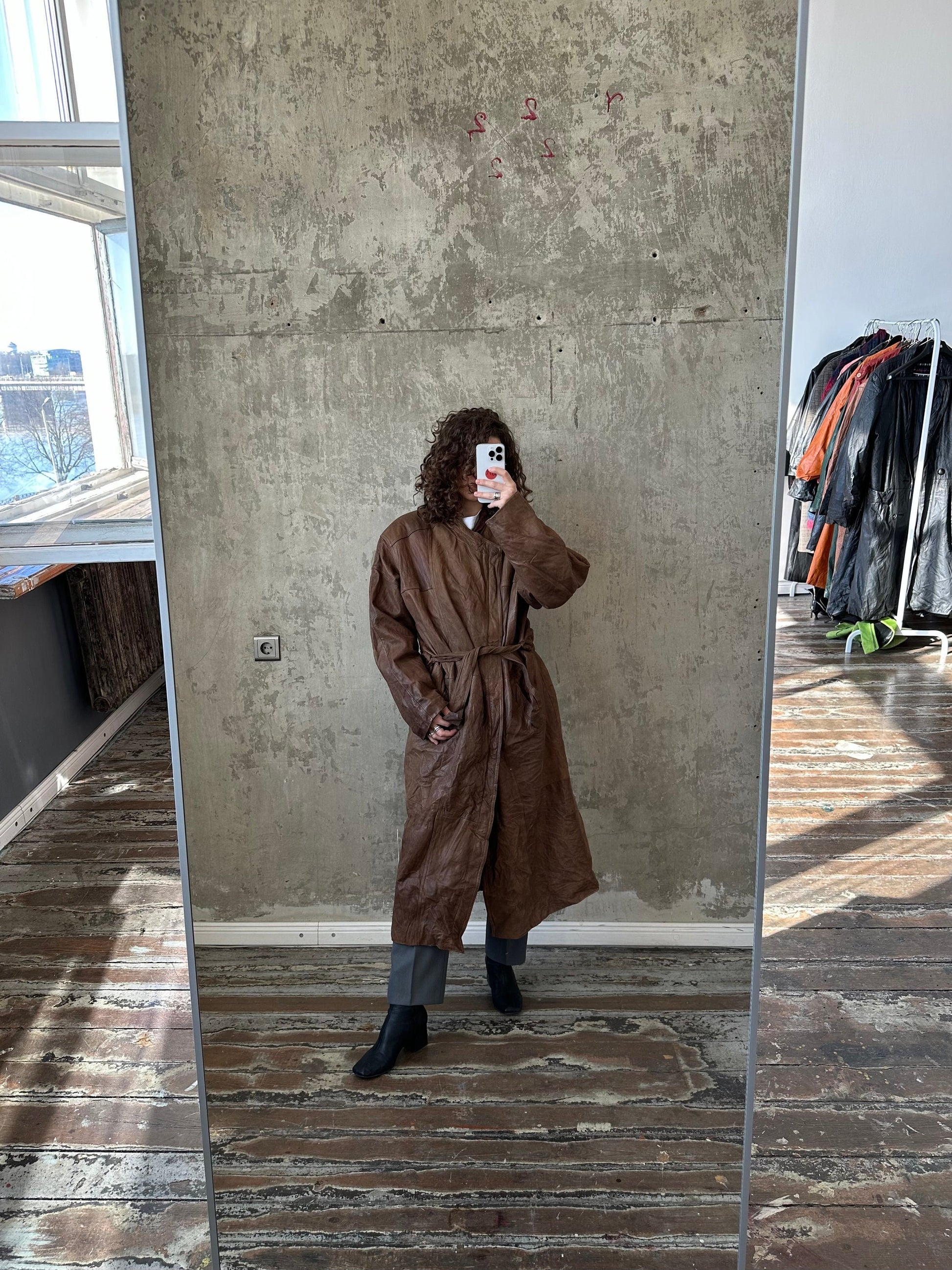 Vintage 90s IOU leather coat in brown, maxi length, gender neutral, belted, zipper closure, padded, fits S-M, genuine leather, oversized/loose fit, massive, good vintage condition