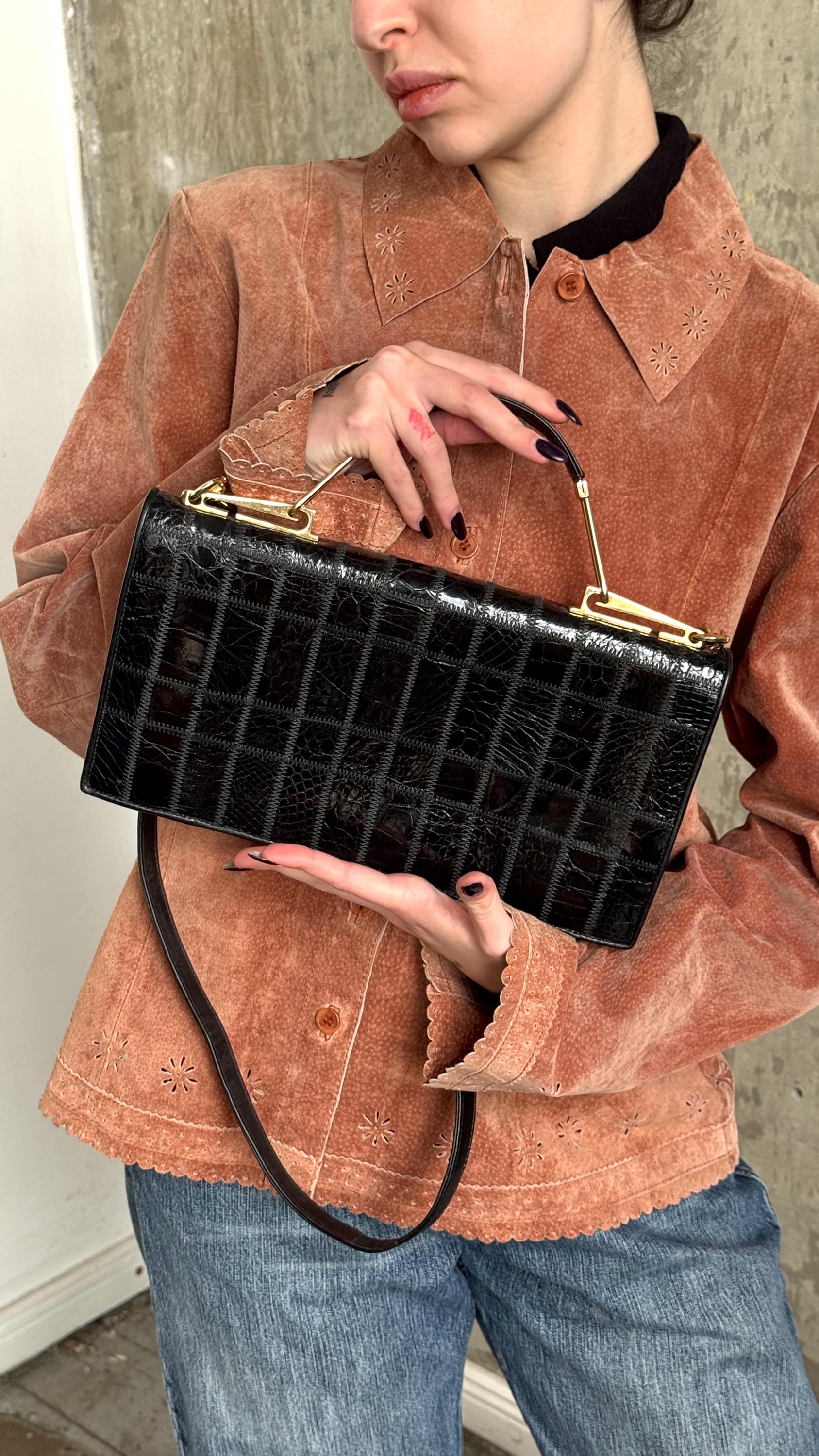 Vintage 90s brown suede leather jacket, boxy, gender-neutral silhouette and soft, supple, velvet texture. This oversized, long-sleeved jacket has a single-breasted button-front closure and is adorned with unique decorative details for a standout, western-inspired look. Made from 100% leather. Fits sizes XS-M (marked as size L). In excellent vintage condition.