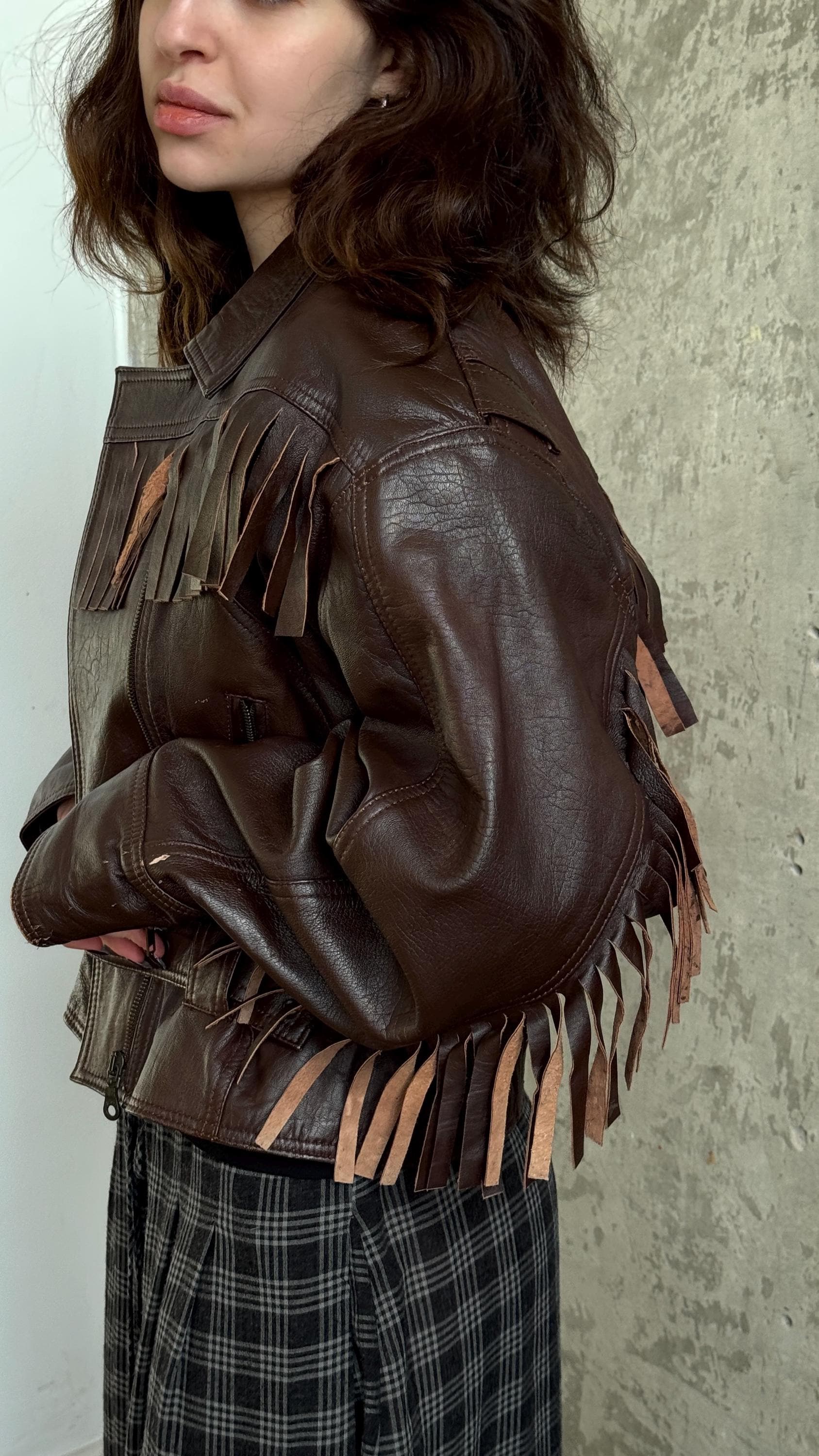 Vintage brown biker leather jacket in a cowboy-inspired style, featuring a loose-fit, gender-neutral silhouette and soft texture. This oversized, long-sleeved jacket has a zipper closure and is adorned with unique decorative details for a standout - fringe, belt, has pockets, western-inspired look. Fits sizes S-L. In excellent vintage condition.