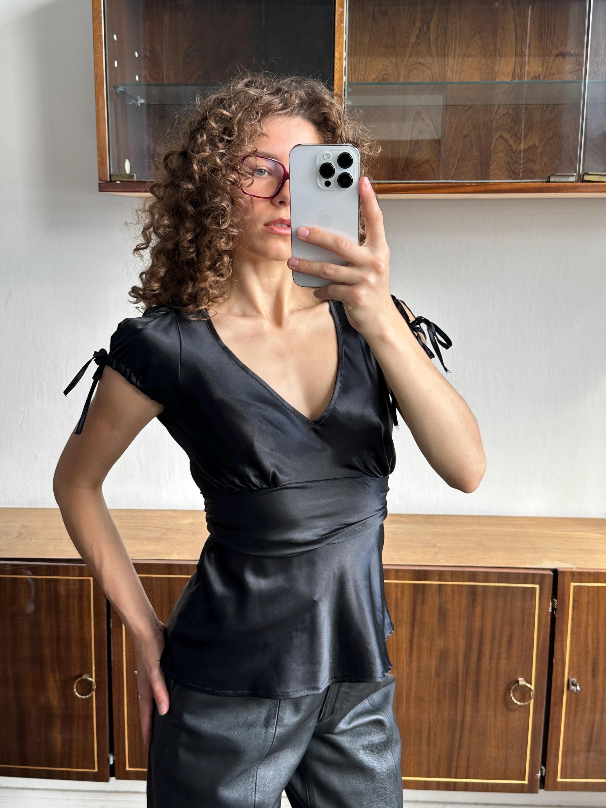 Vintage Sandro Ferrone belted satin top in black, slim-fitted, waist is regulated with belt, decorated with ropes on the sleeves, short-sleeved, V-neck, very light and soft, made in Italy, made of 97% polyester, 3% elastane, fits XS-S (marked as S size), perfect vintage condition