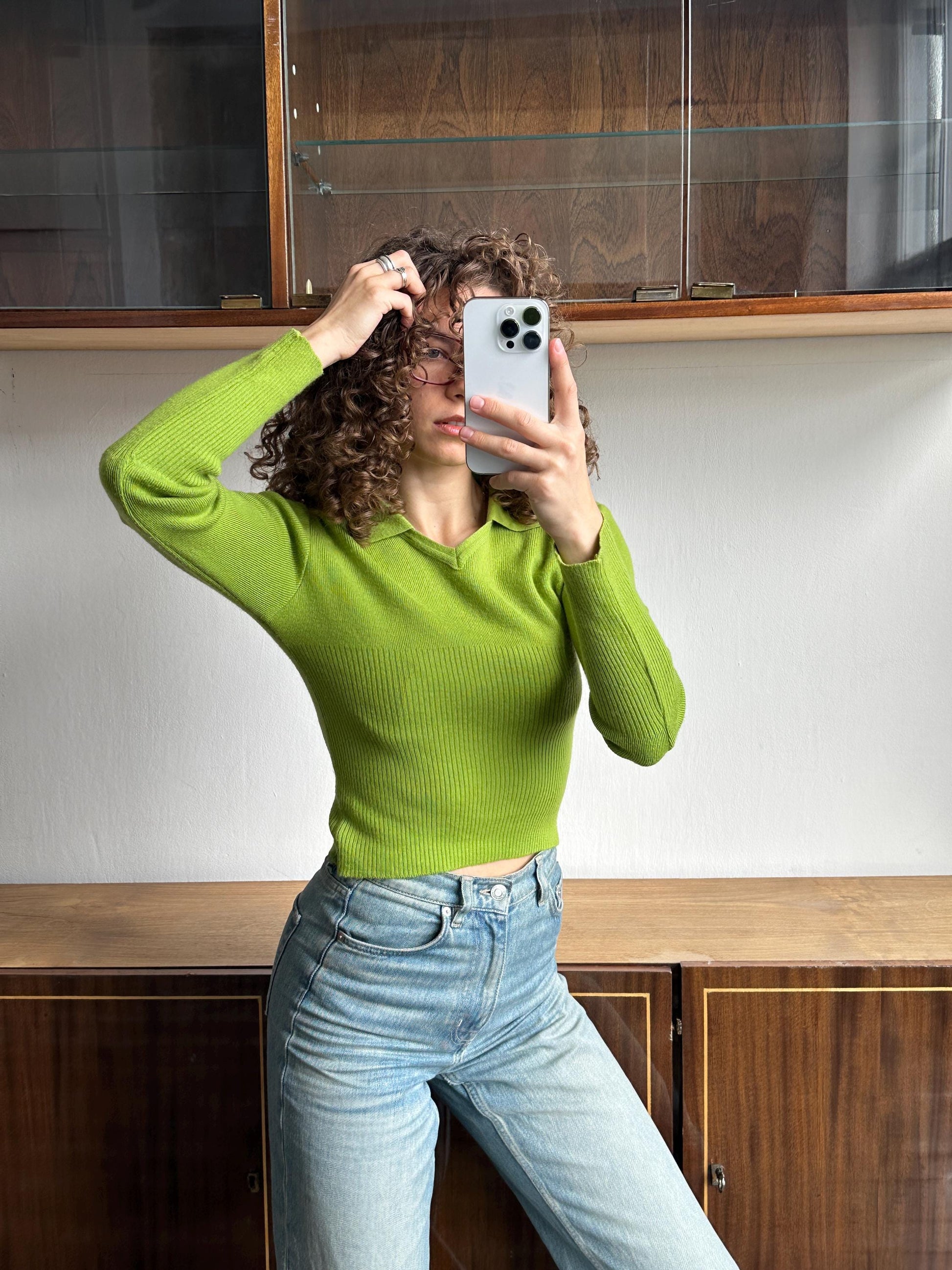 Vintage wool jumper in green / lime, long-sleeved, cropped, collared, slim-fitted, elastic, very light and soft, fits XS-M (marked as S size), made of 50% merino wool, 50% acrylic, perfect vintage condition