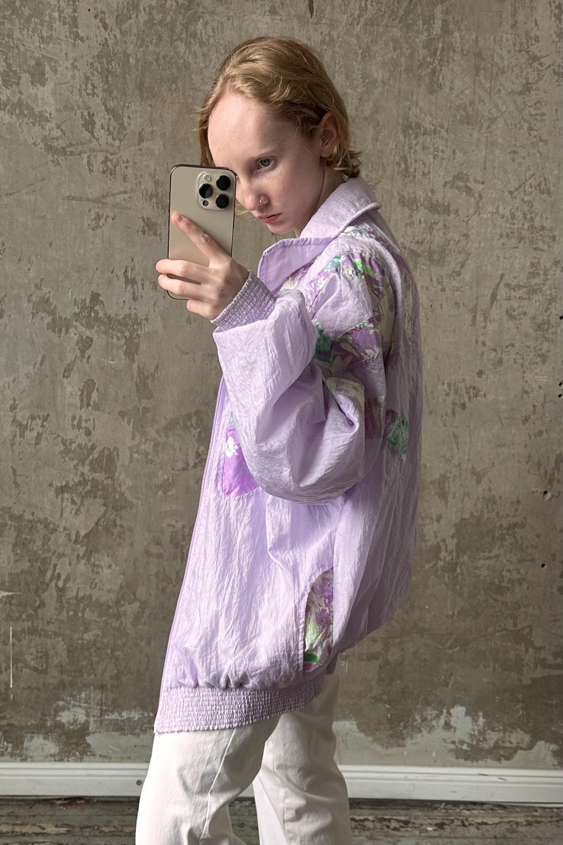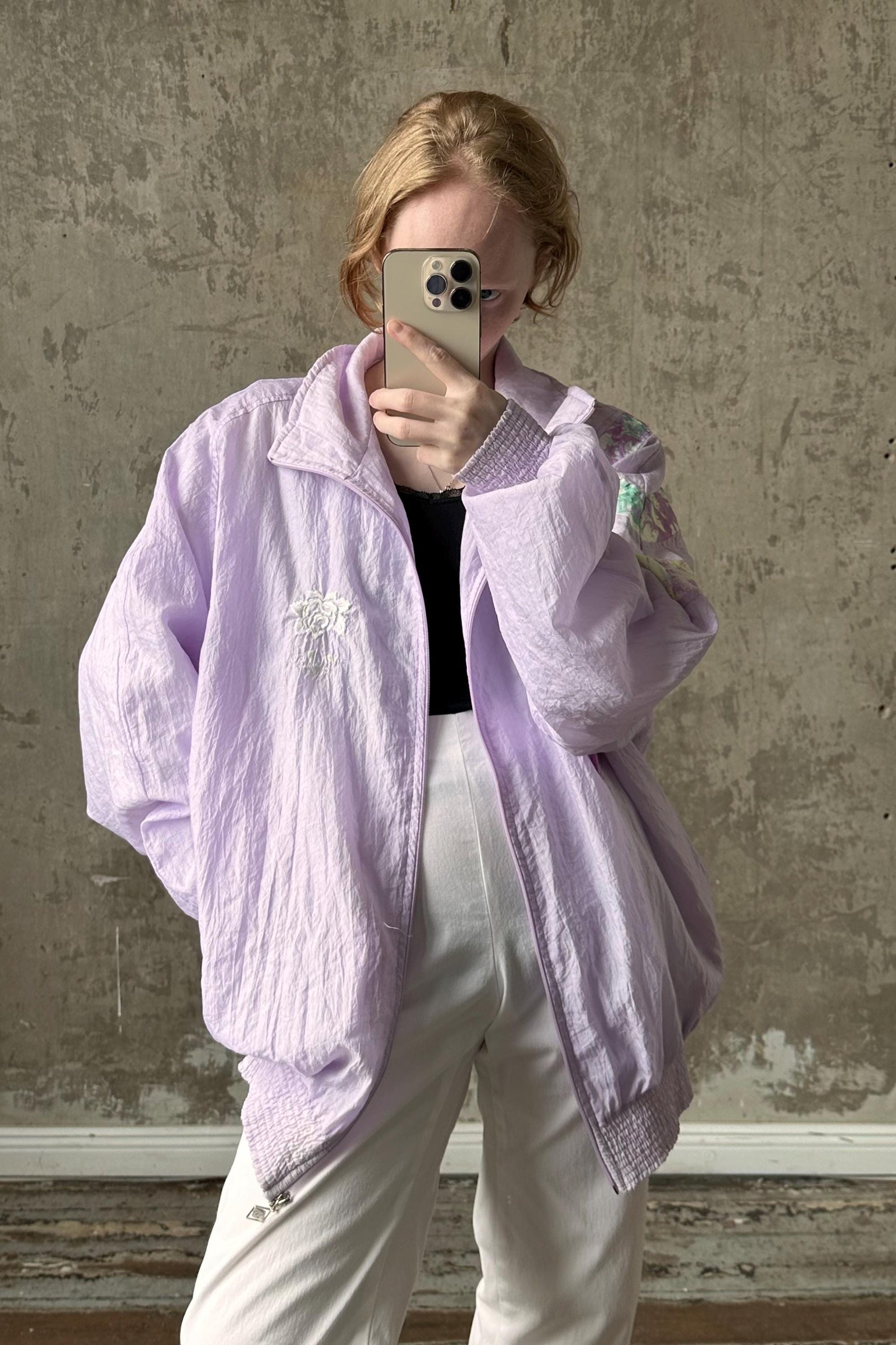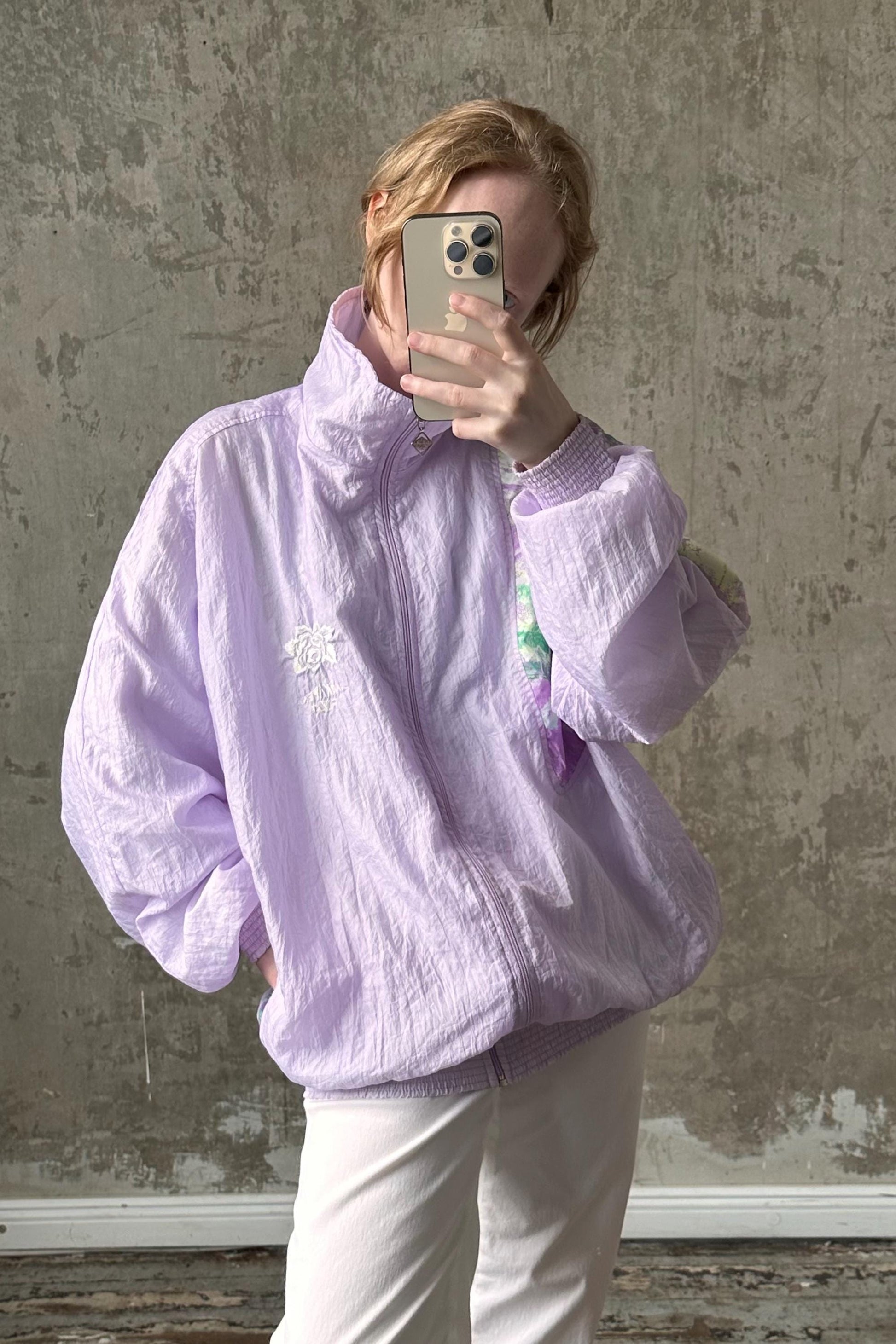 Vintage y2k cute lightweight athletic oversized jacket in light purple, raincoat/windbreaker, long-sleeved, with abstract cute print and flower embroidery, very light, has pockets, with elastic band, cropped, collared, oversized/loose-fit, zipper closure, fits S-L, good vintage condition (zipper closure sticks a little)