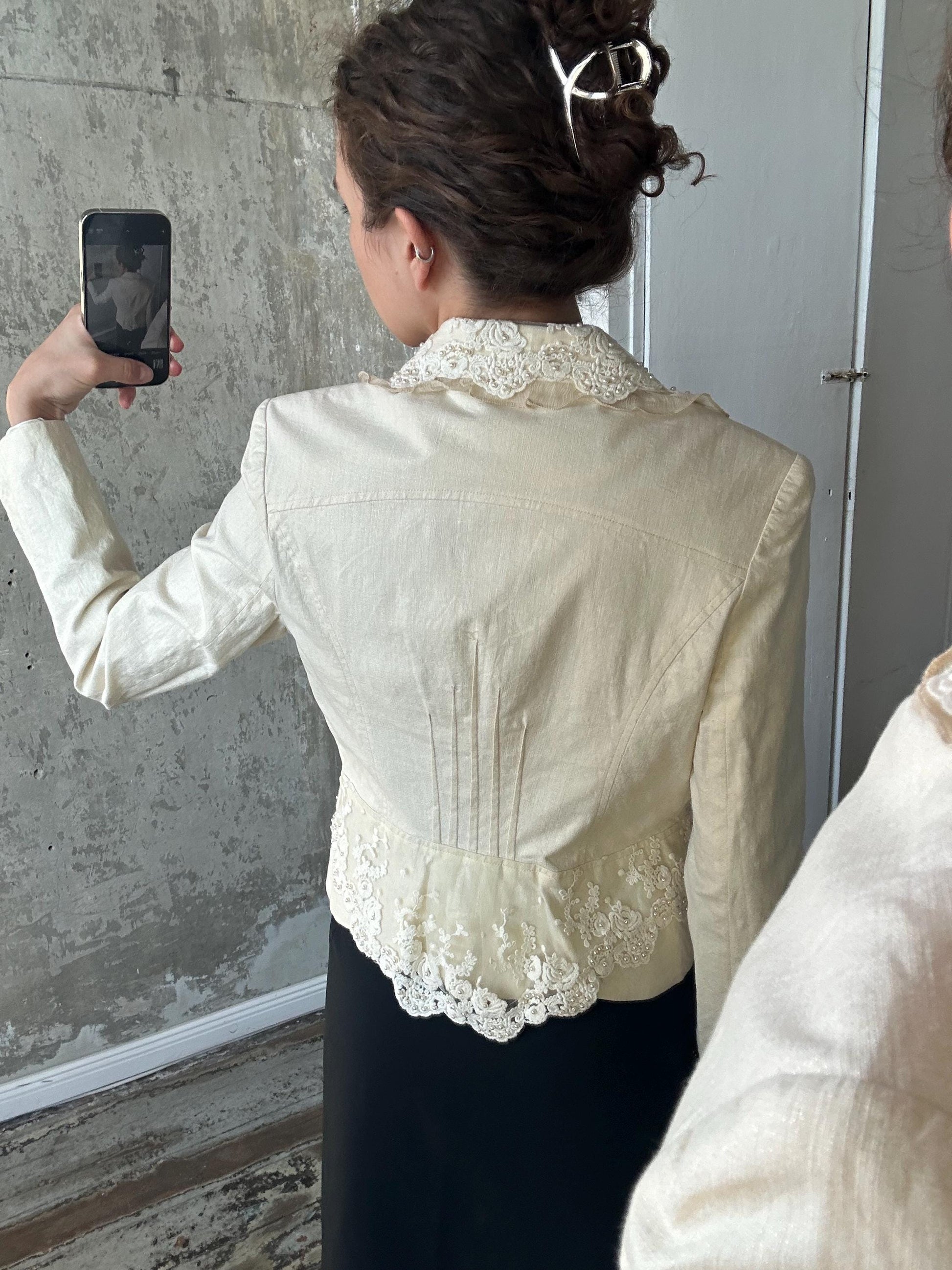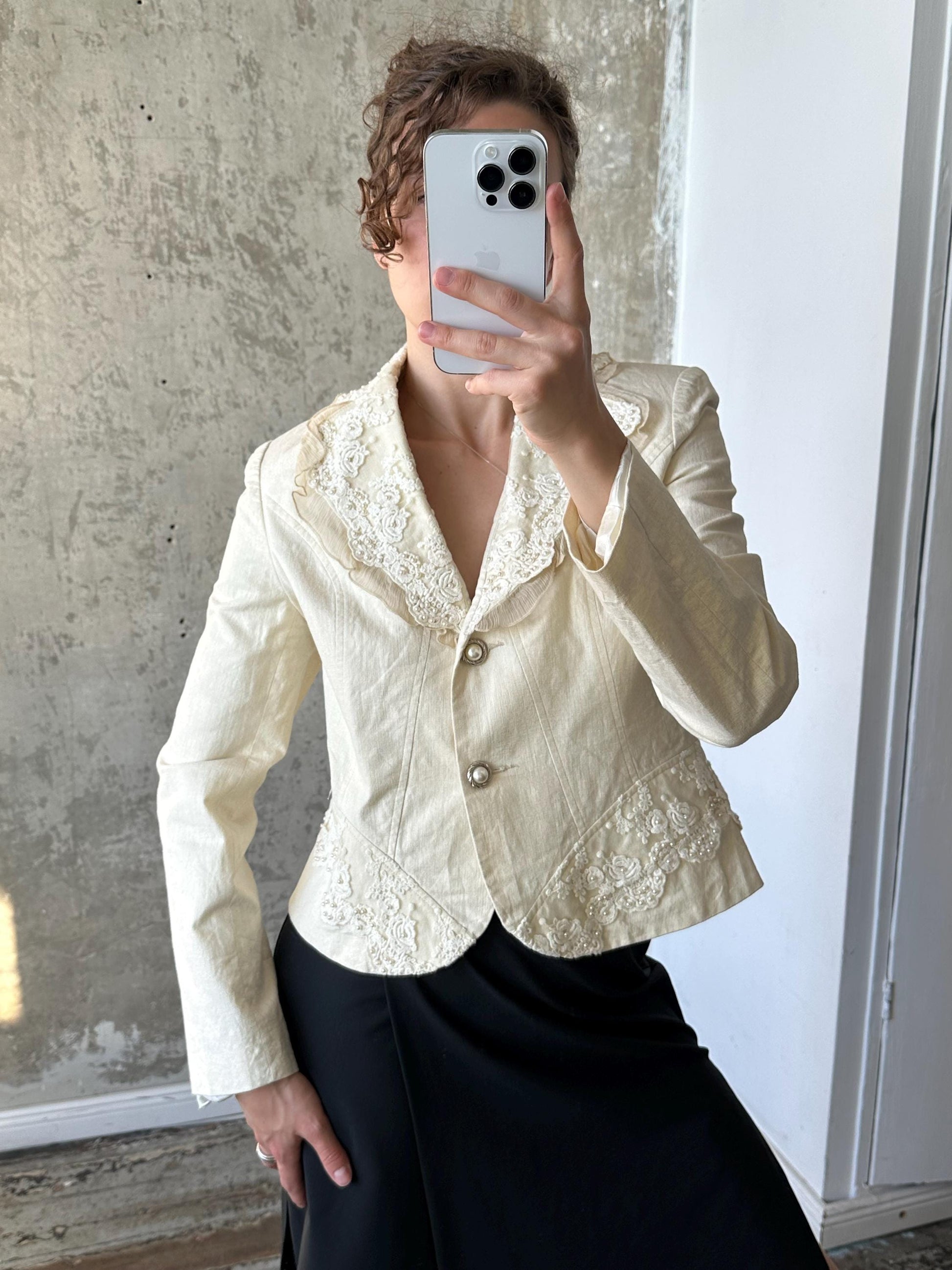Vintage blazer in white (ivory). Button closure, slim-fitted, fits XS-M, light, the fabric has a textured, brocade or jacquard finish, giving it an elegant and refined appearance, made of cotton, decorated with lace and embroideries, perfect vintage condition
