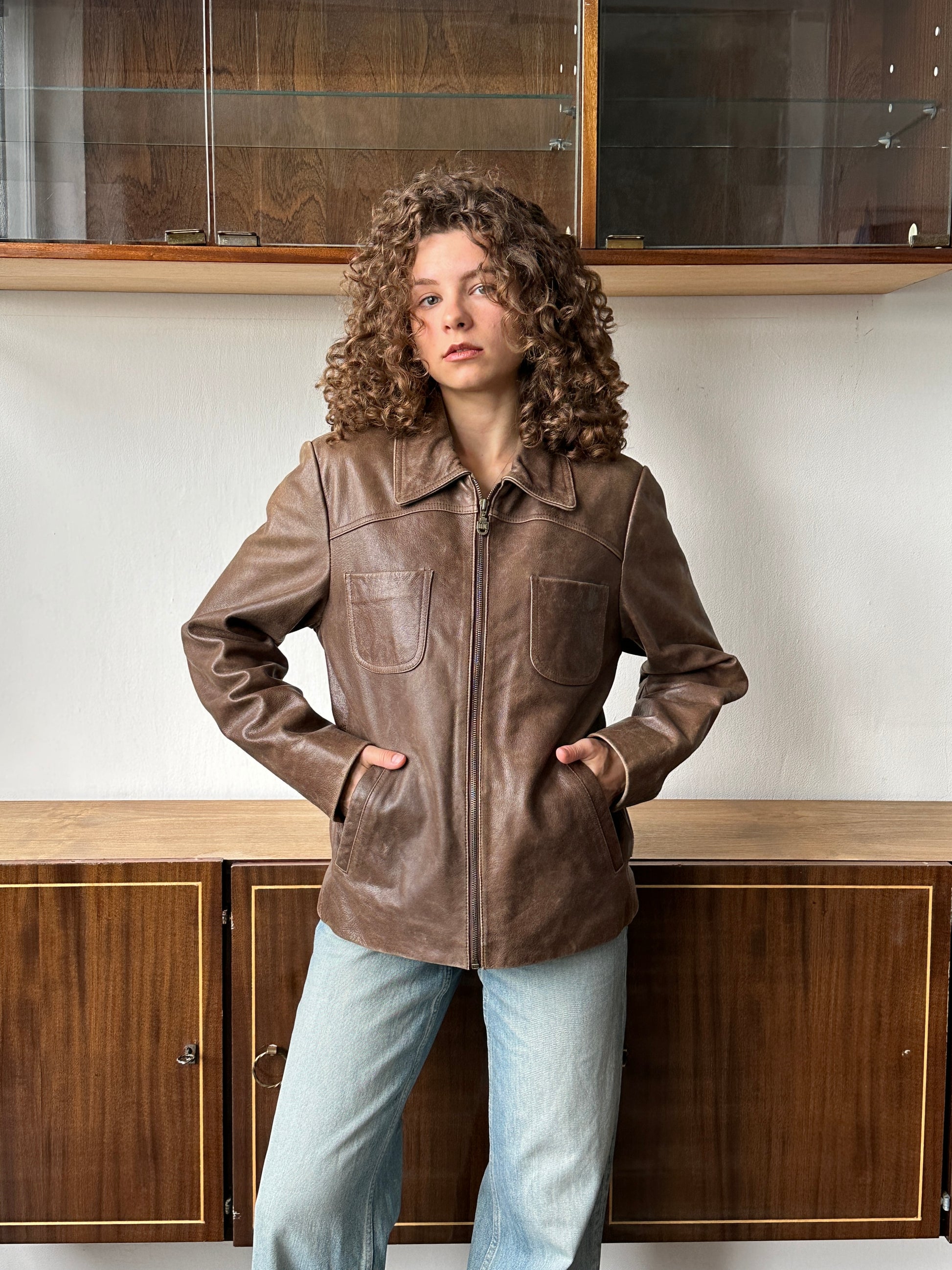 Vintage brown leather jacket, made of 100% genuine leather, lining 50% nylon, 50% acetate, 100% polyester, burnt/distressed, gender-neutral, belted on the back, collared, two side pockets, boxy-shape, fitted, zipper closure, fits XS-M (marked as 40 size), made in China, leather is dense, perfect vintage condition