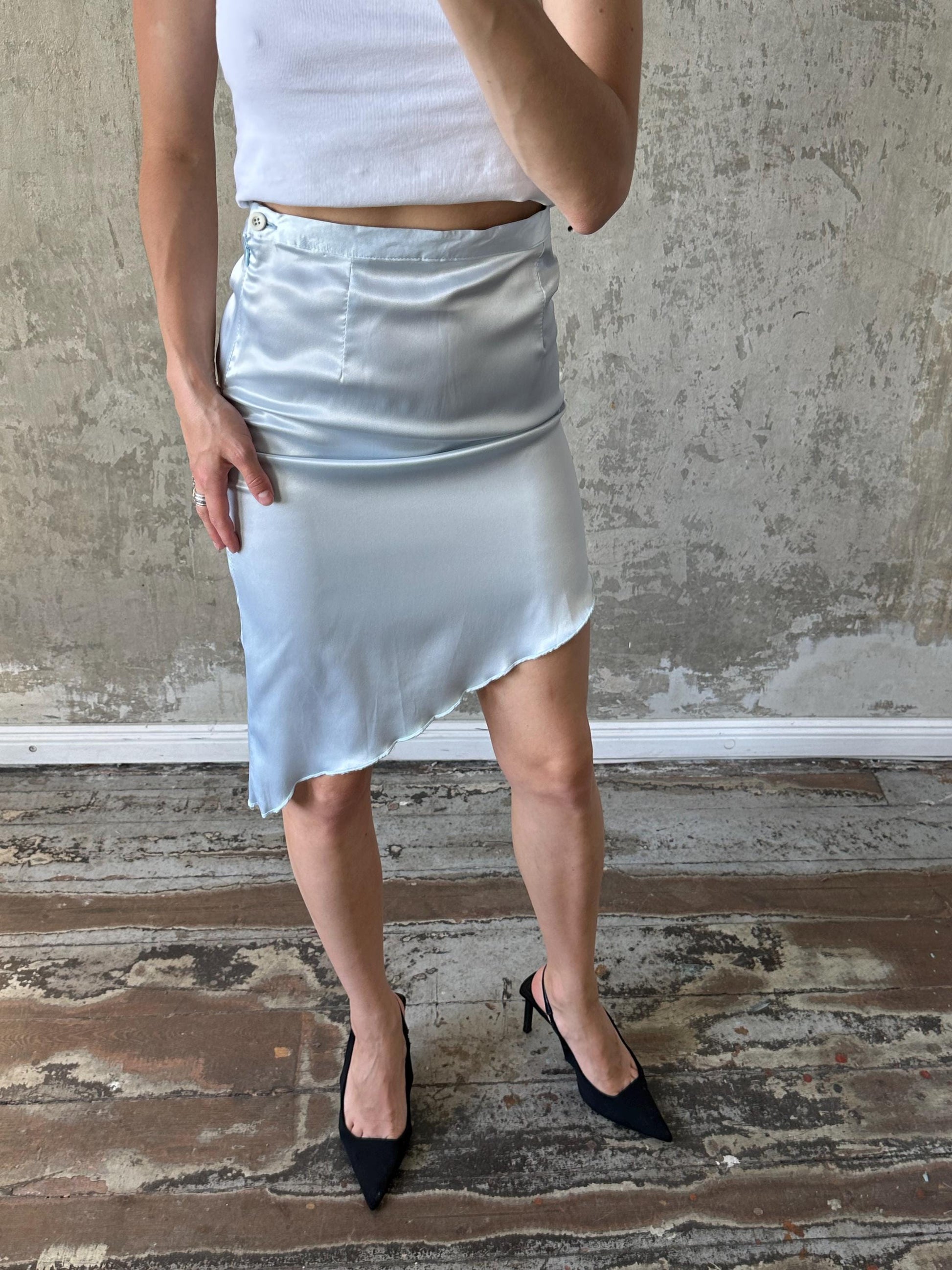 Vintage mini skirt with asymmetrical edge in light blue, the skirt features a lightweight, airy fabric, slim-fitted, very light and soft, zipper closure, made of 100% viscose, fits XS-S, made in Italy, perfect vintage condition