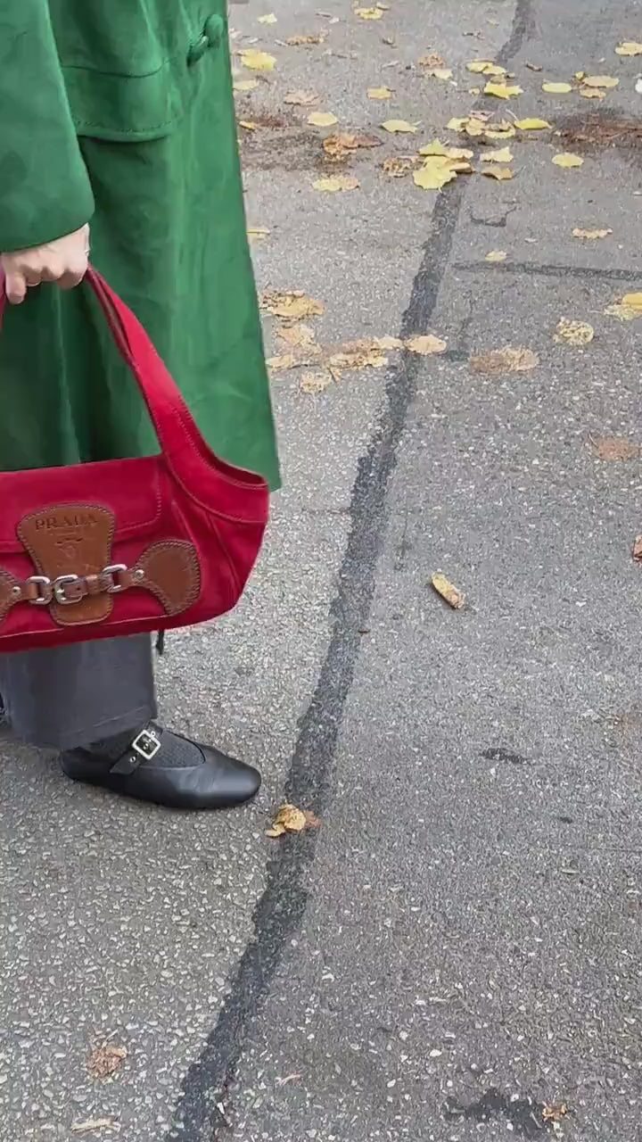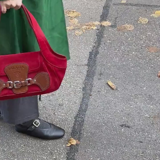 PRADA suede leather handbag in red features suede bag, shoulder strap, leather flap at front and single interior zip pocket, made in Italy, perfect vintage condition