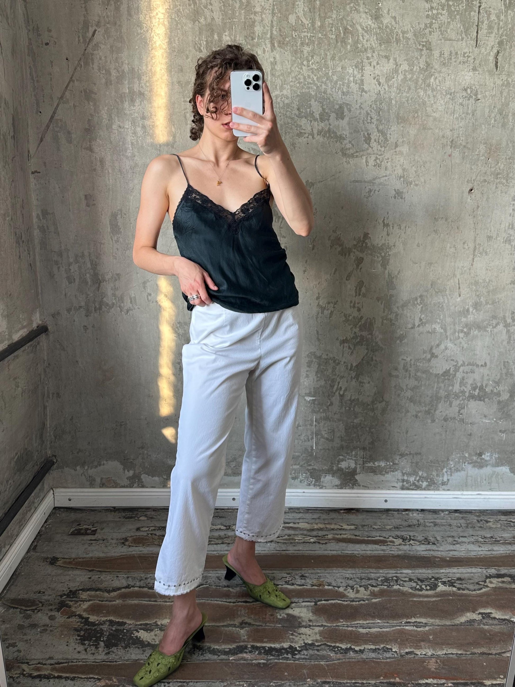 Vintage pure silk nightie top in black, loose-fit, long, decorated with lace on the neck, sleeveless, on straps (not adjustable), made of 100% silk, fits XS-S, top is delicate and elegant, flowy, perfect vintage condition