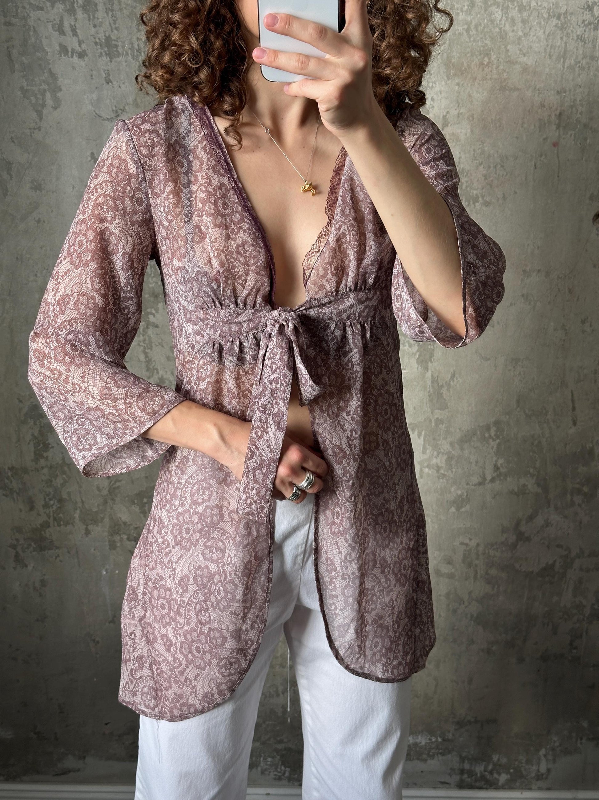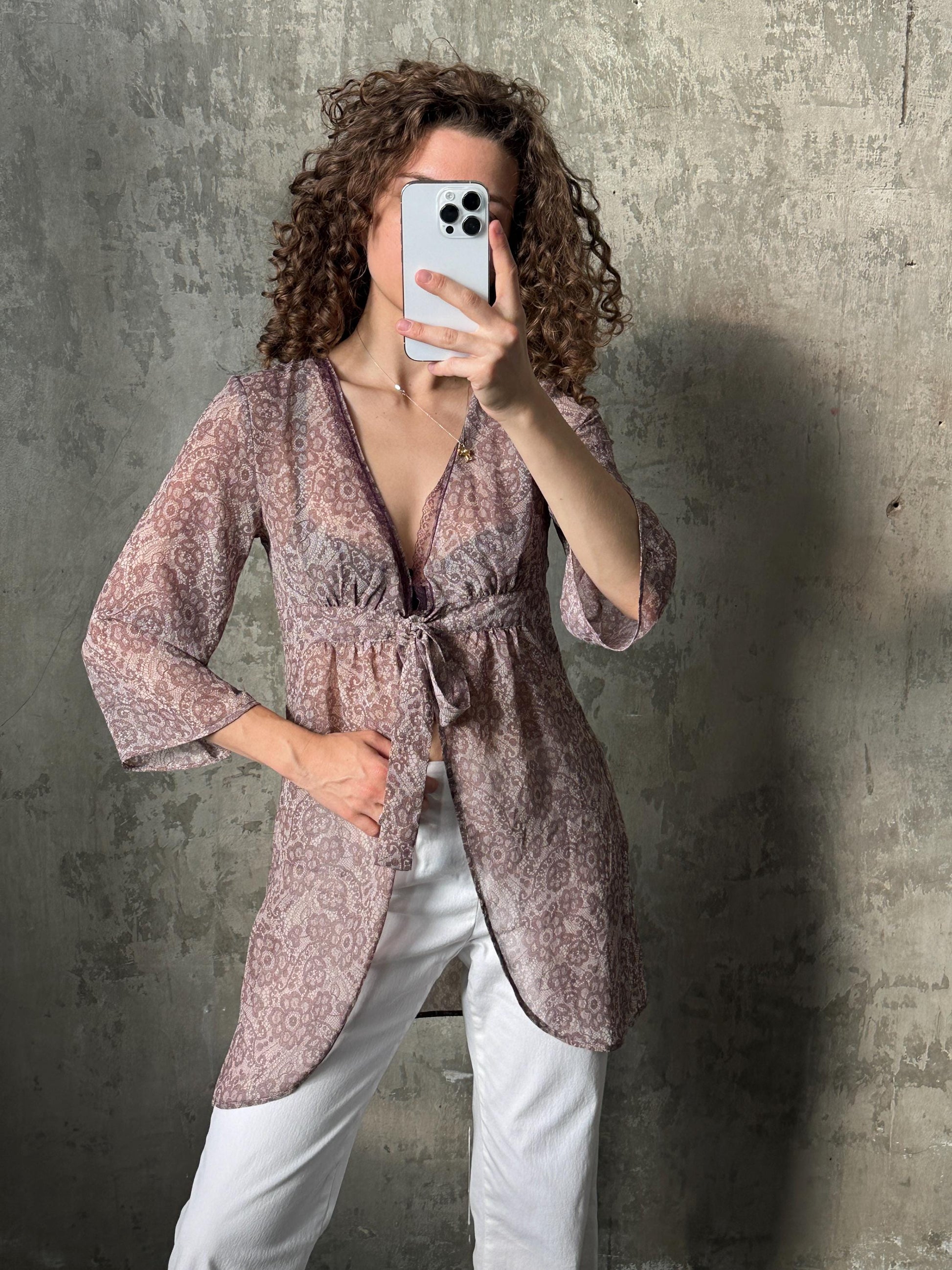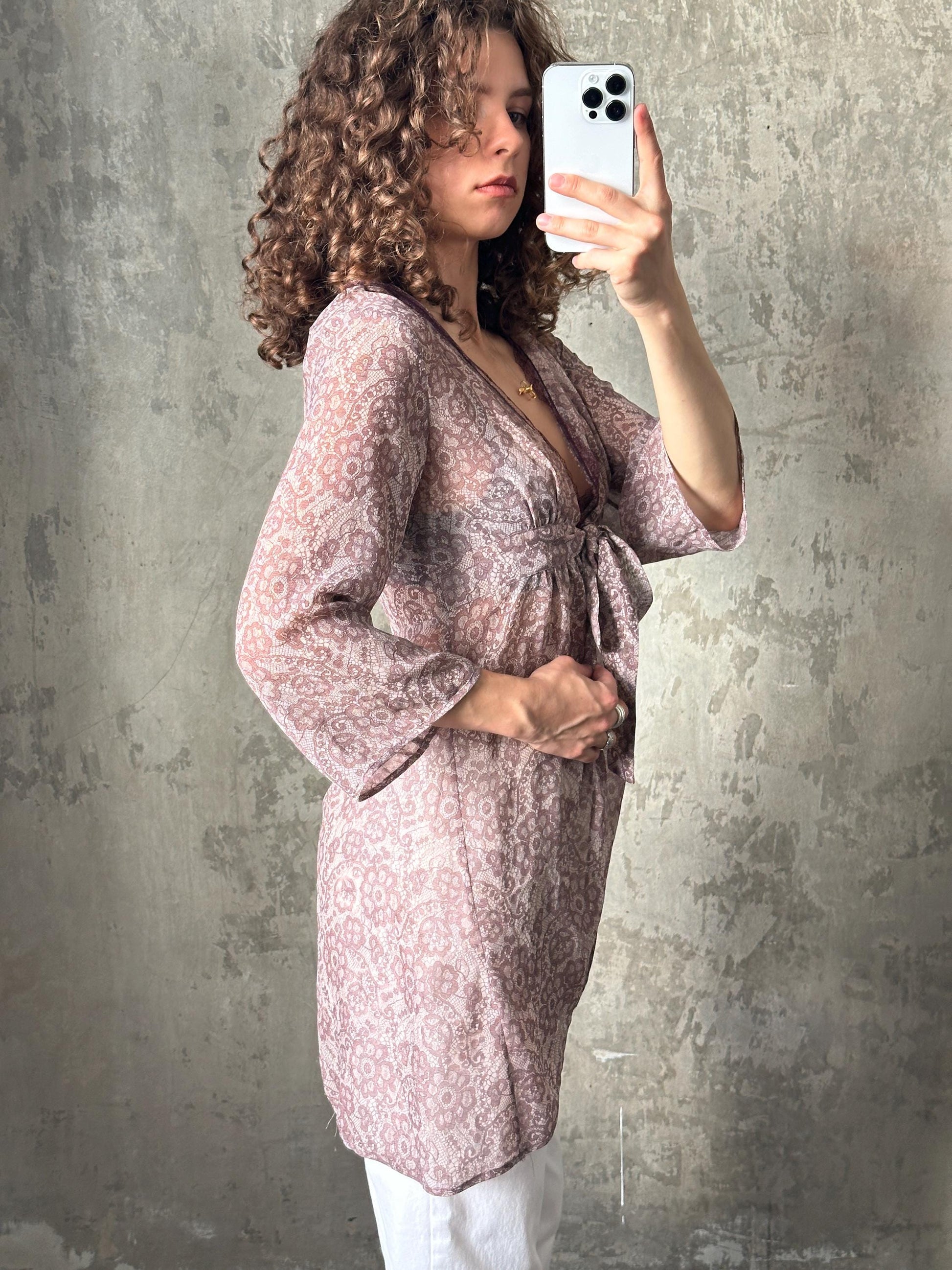 Vintage women blouse/nightie dress with floral print, semi-transparent, half sleeve, tie closure, decorated with ruffles, midi (knee) length, bell sleeves, loose fit, made of 100% polyester, fits XS-M size, perfect vintage condition