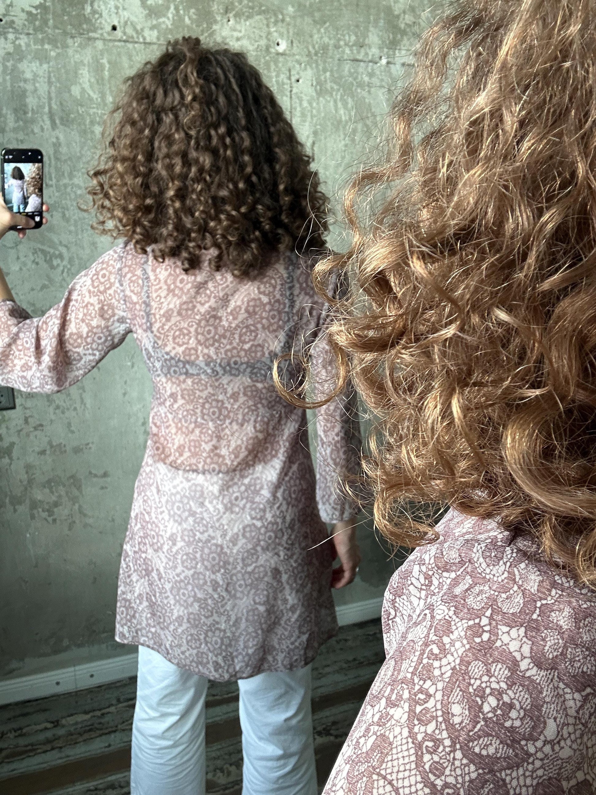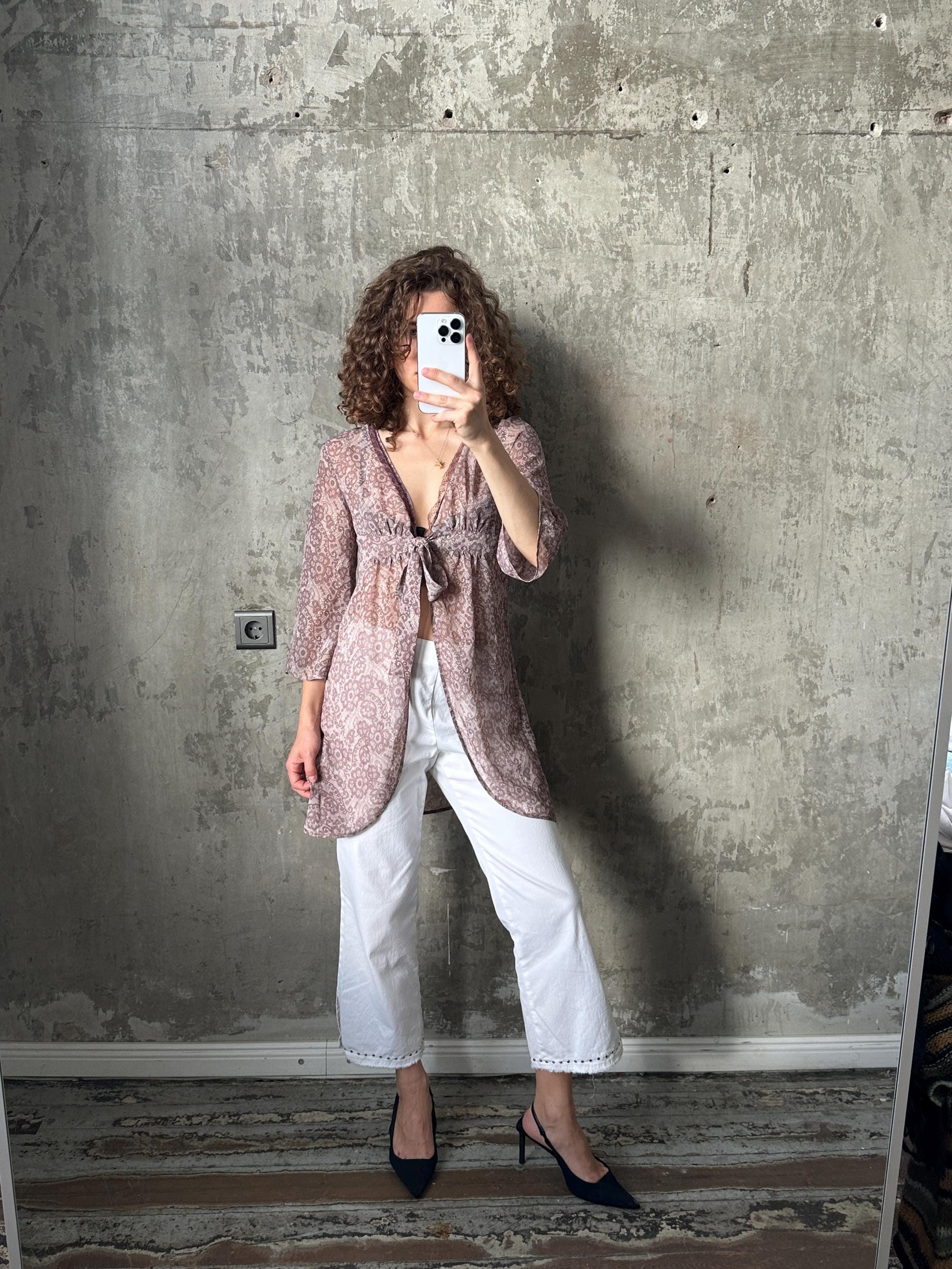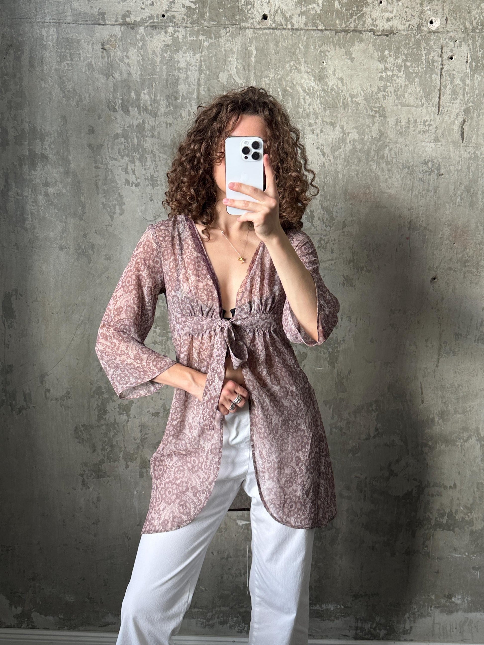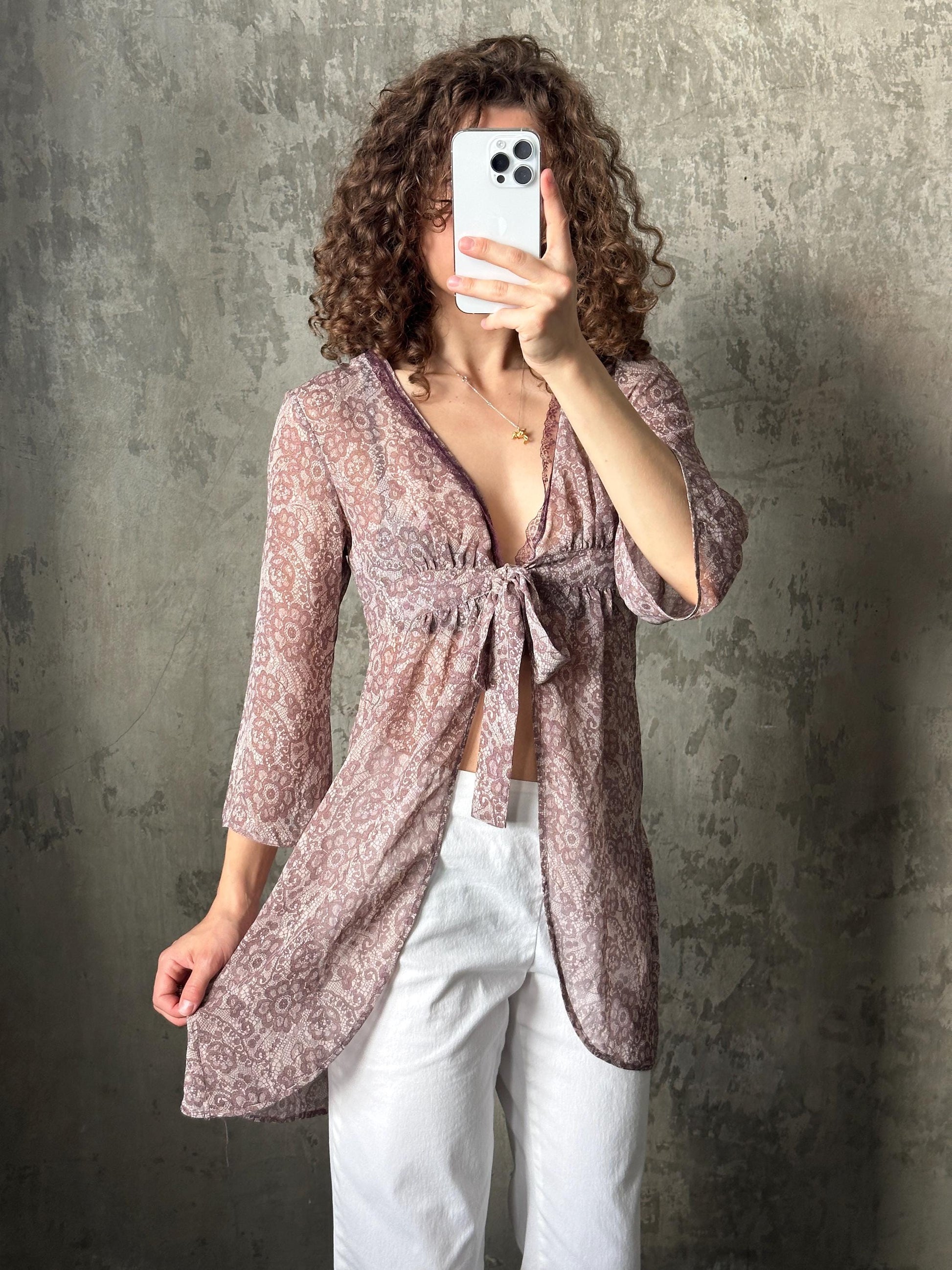 Vintage women blouse/nightie dress with floral print, semi-transparent, half sleeve, tie closure, decorated with ruffles, midi (knee) length, bell sleeves, loose fit, made of 100% polyester, fits XS-M size, perfect vintage condition