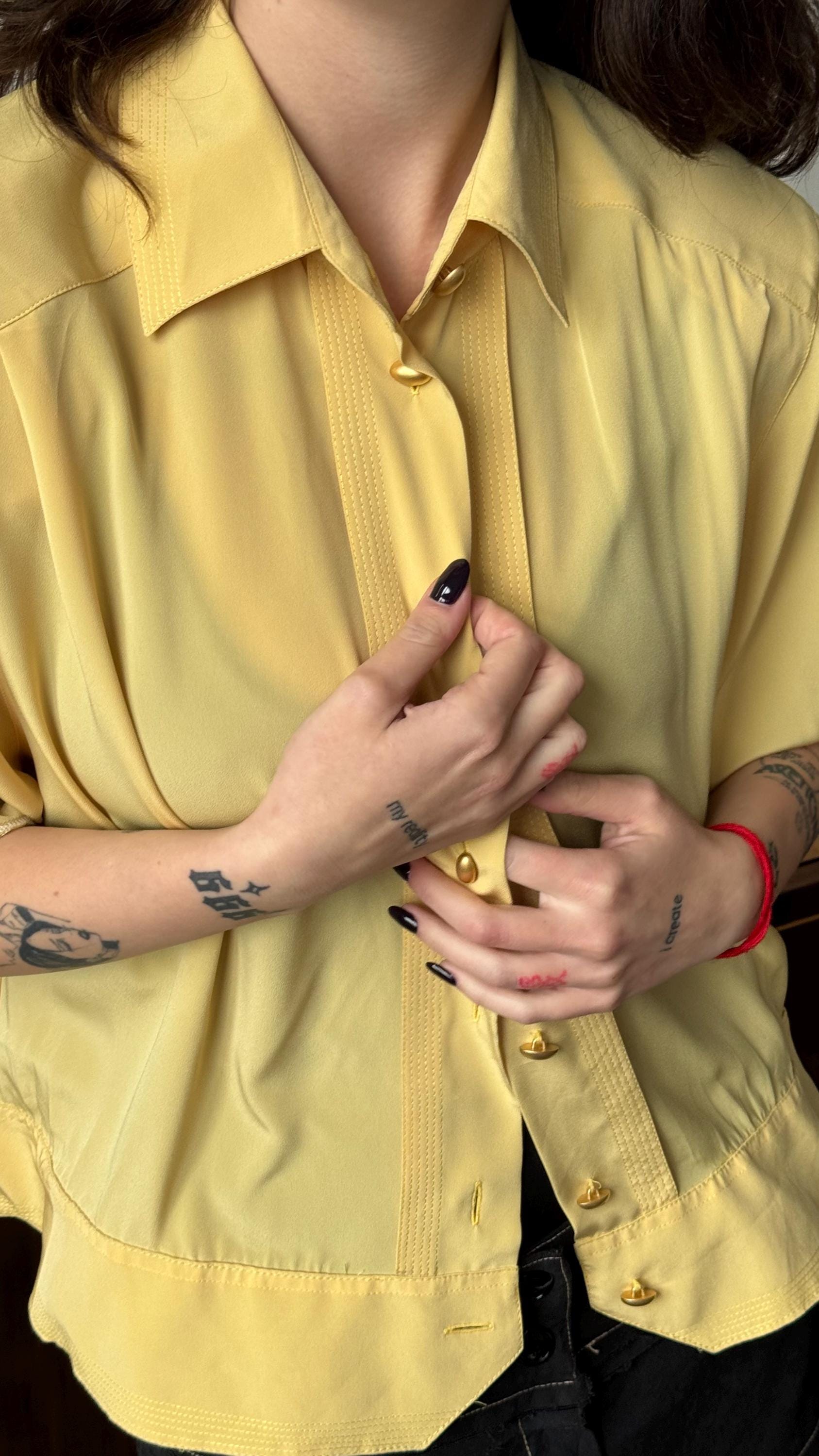 Vintage short-sleeve blouse in yellow with shoulder inserts, short sleeved, gender-neutral, button closure, collared, very light and soft, made of 100% polyester, fits XXS-M, loose-fit, perfect vintage condition