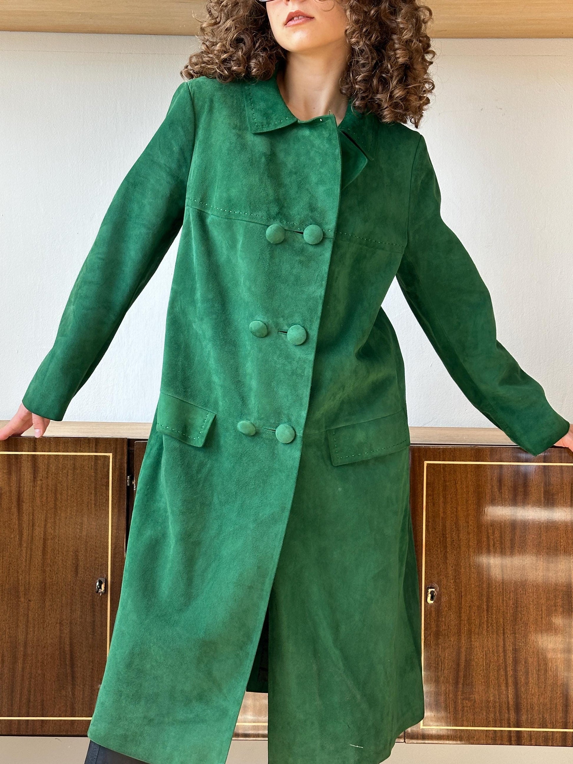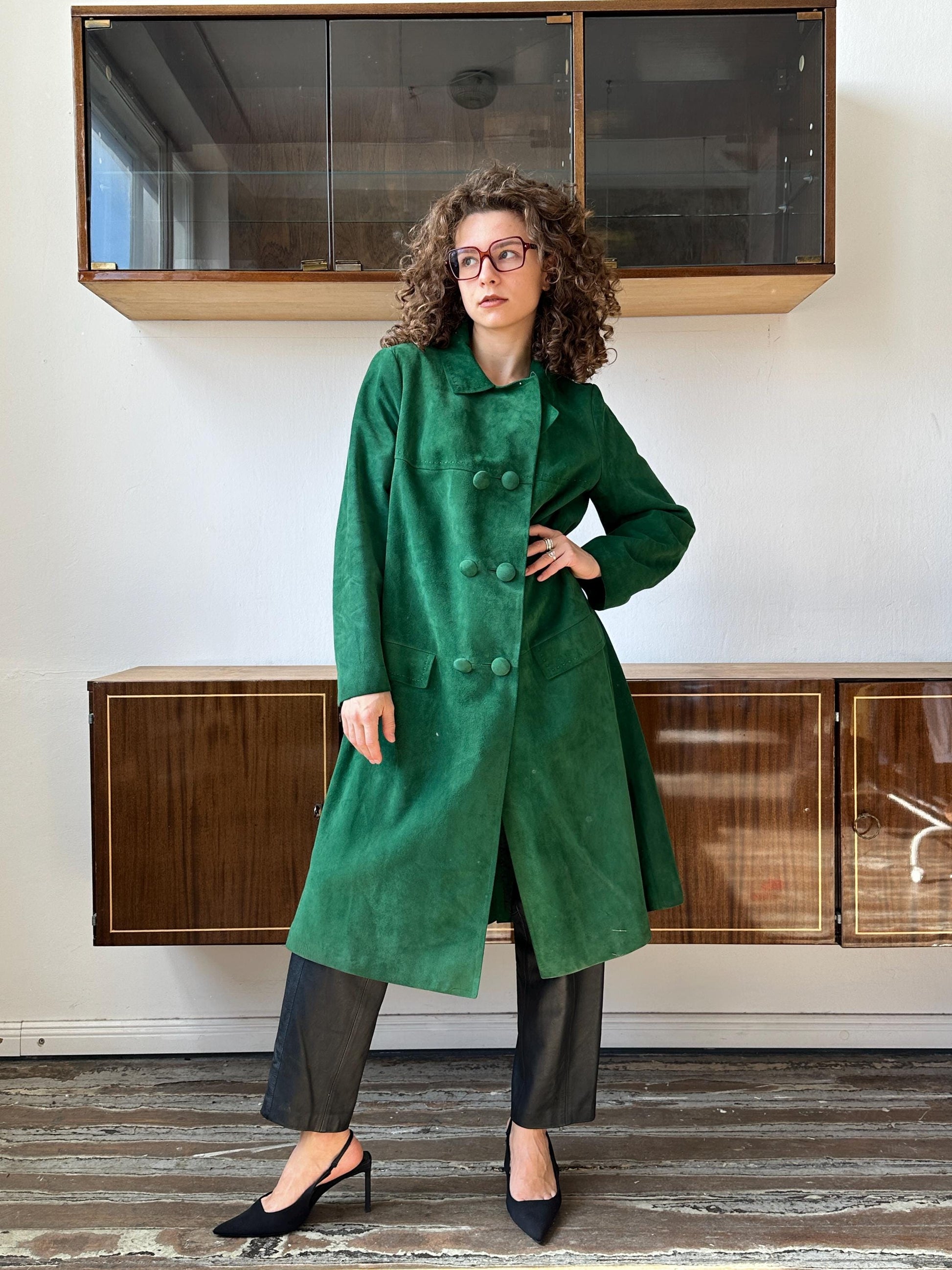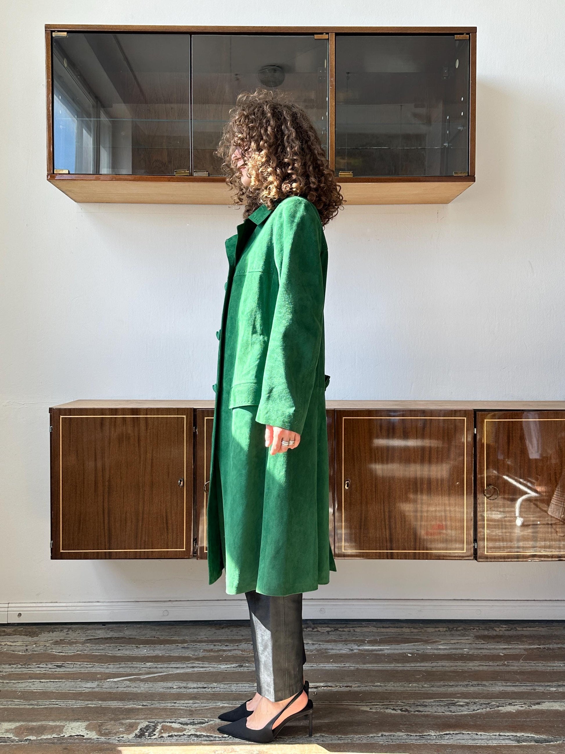 Vintage 90s leather coat in bright green, genuine suede (presumably deer) leather, straight, maxi length, two side pockets, double-breasted, gender neutral, no belt, made in Spain, best fits S-M, gorgeous quality, excellent vintage condition
