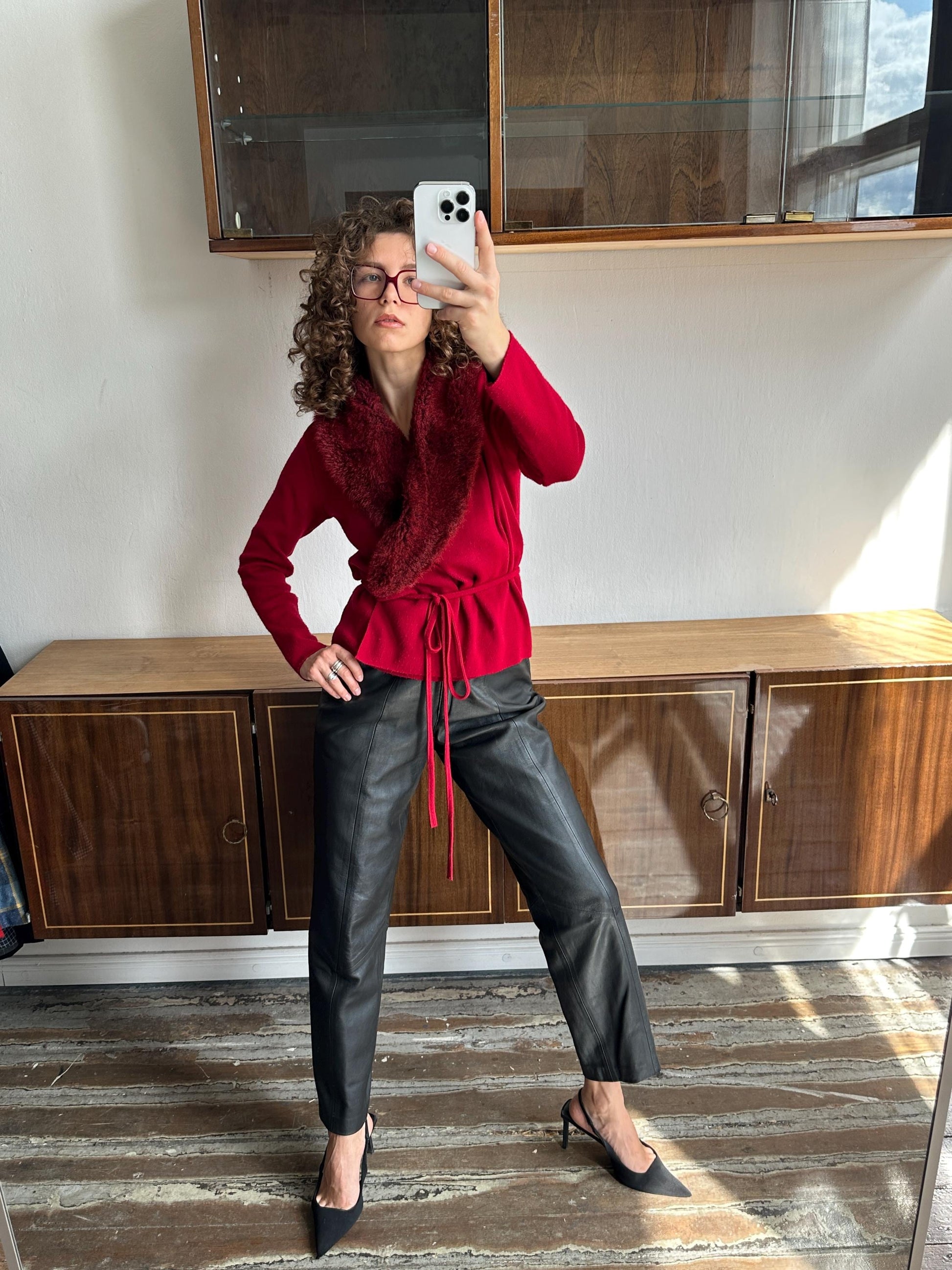 Vintage slim-fit belted red cardigan with fur collar, cropped, made of 100% wool and 100% acryl collar, high-collar is decorated with fur, belted (very long belt), cropped, fits XS-M, perfect vintage condition